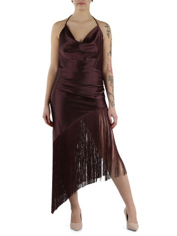 Optionen wählen PINKO Satinkleid mit UV-Licht Fransen Körpergröße des Models (cm): 175Getragene Größe: 40Drapierter KragenSchnürsenkel zum BindenDrapierungFransenAsymmetrischer Saumungefüttert96%POLYESTER4%ELASTANE MSRP: €350,00